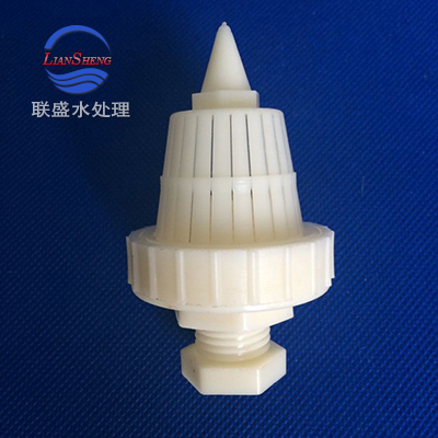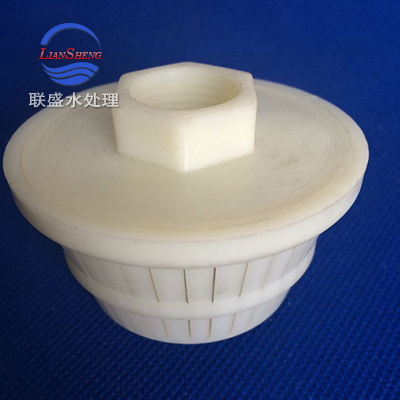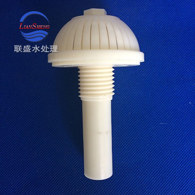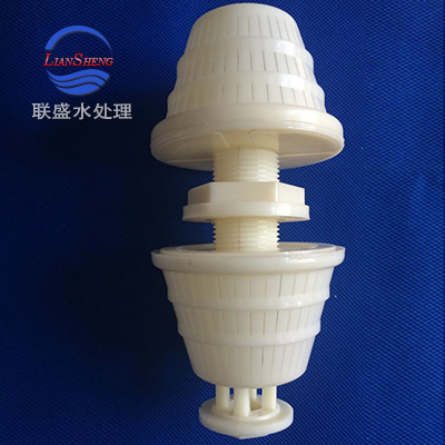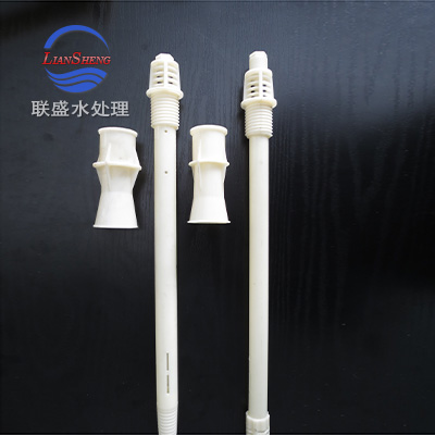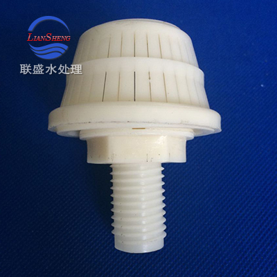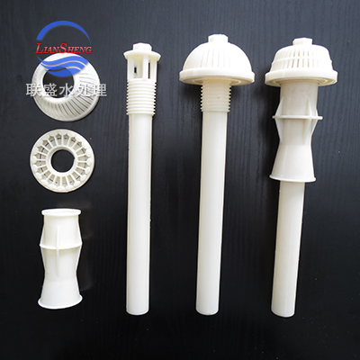 滤头弧面上均匀开有精心加工的长条细缝,既能防止滤料的漏出,又能确保配气和配水均匀。滤杆是一根塑料管顶端开有一个小孔,靠近底部有二条进气条缝,压缩空气进入滤板下面的空间后,缓慢地形成空气层,并逐渐变厚,空气层下面的水不断下降,直到水面降至滤杆下部的长条进气条缝处时,这时空气开始由条缝孔流入滤杆。当流进的空气流量与经滤帽缝隙流流走的流量相等时,水面便停止下降,稳定在一定位置上,进入的空气经滤杆上升通过滤帽的缝隙喷射到滤料层中去,由于多个滤头的交叉喷射均匀分布,达到良好的反冲洗效果。